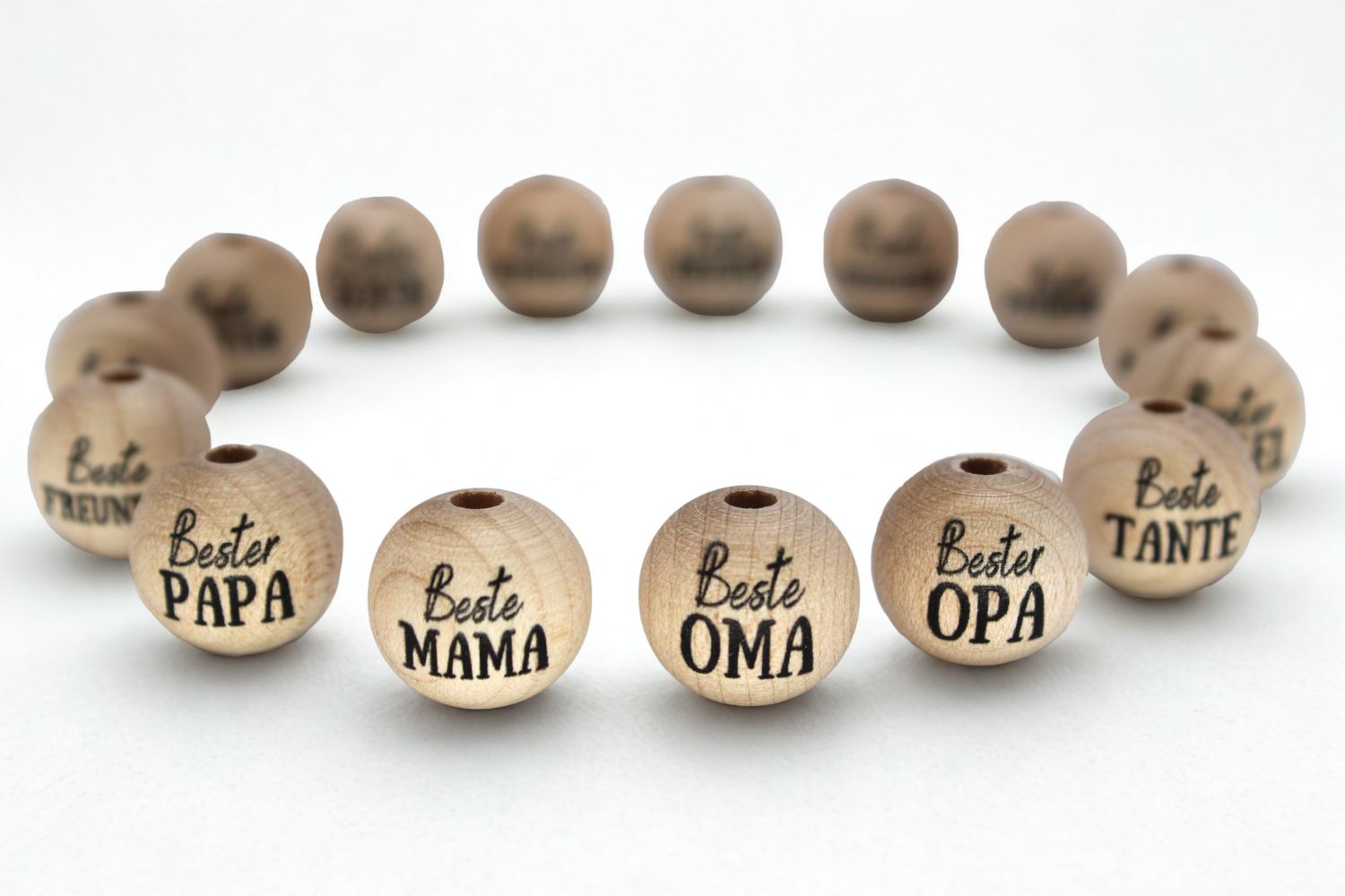 Diese hochwertigen, runden Holzperlen aus Ahornholz werden in Deutschland gefertigt und sind in den Größen 15mm, 18mm und 20mm erhältlich. Sie sind mit beliebten Schriftzügen wie „Beste Mama“, „Bester Papa“, „Beste Oma“, „Bester Opa“ und vielen weiteren einseitig bedruckt.