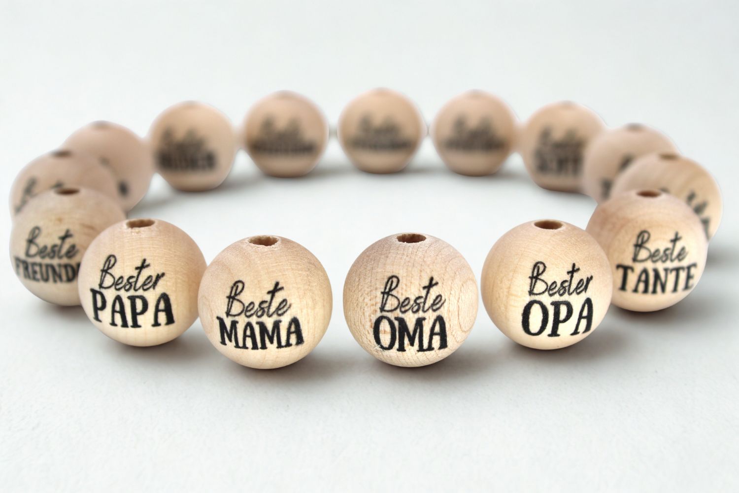 Diese hochwertigen, runden Holzperlen aus Ahornholz werden in Deutschland gefertigt und sind in den Größen 15mm, 18mm und 20mm erhältlich. Sie sind mit beliebten Schriftzügen wie „Beste Mama“, „Bester Papa“, „Beste Oma“, „Bester Opa“ und vielen weiteren einseitig bedruckt.
