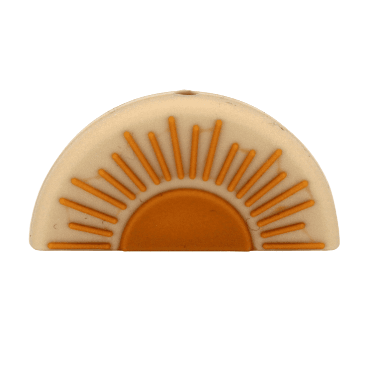 - Motivperle aus Silikon in Form einer aufgehenden Sonne. Sie ist in drei verschiedenen Farbvarianten erhältlich. Die Sonne ist auf beiden Seiten der Perle gleich gestaltet.